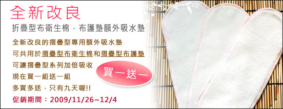 全新改良的摺疊型專用額外吸水墊,可共用於摺疊型布衛生棉和摺疊型布護墊,現在買一組送一組,多買多送,只有九天喔,促銷期間︰2009/11/26~12/4!!